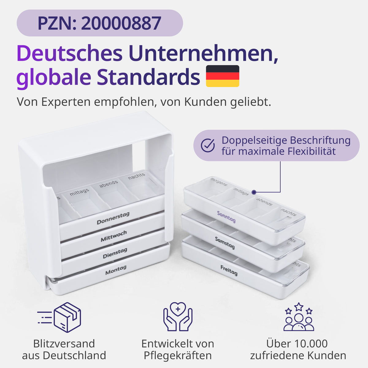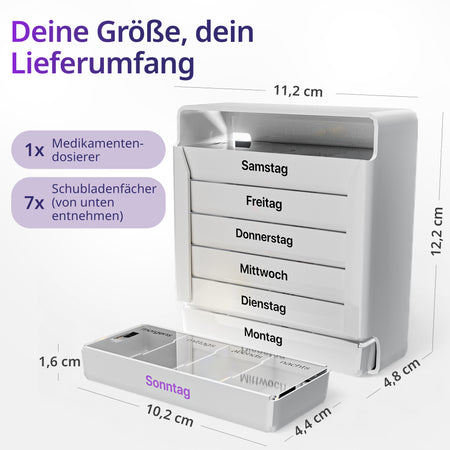 Diskretes Design, herausnehmbare Tagesboxen – nimm einfach den aktuellen Tag mit: Büro, Reise oder Pflege.