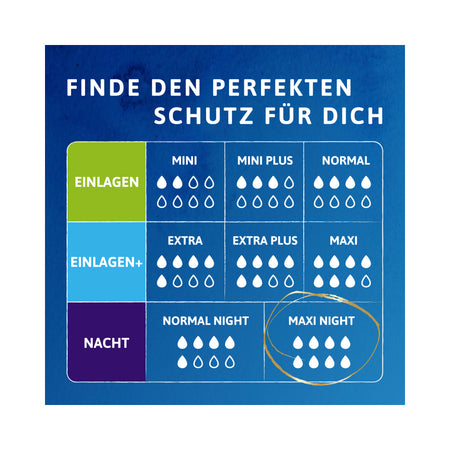 - Bis zu 12 Stunden Schutz dank Dry Fast Core™ Saugkern – leitet Flüssigkeit schnell ab und hält sie sicher eingeschlossen