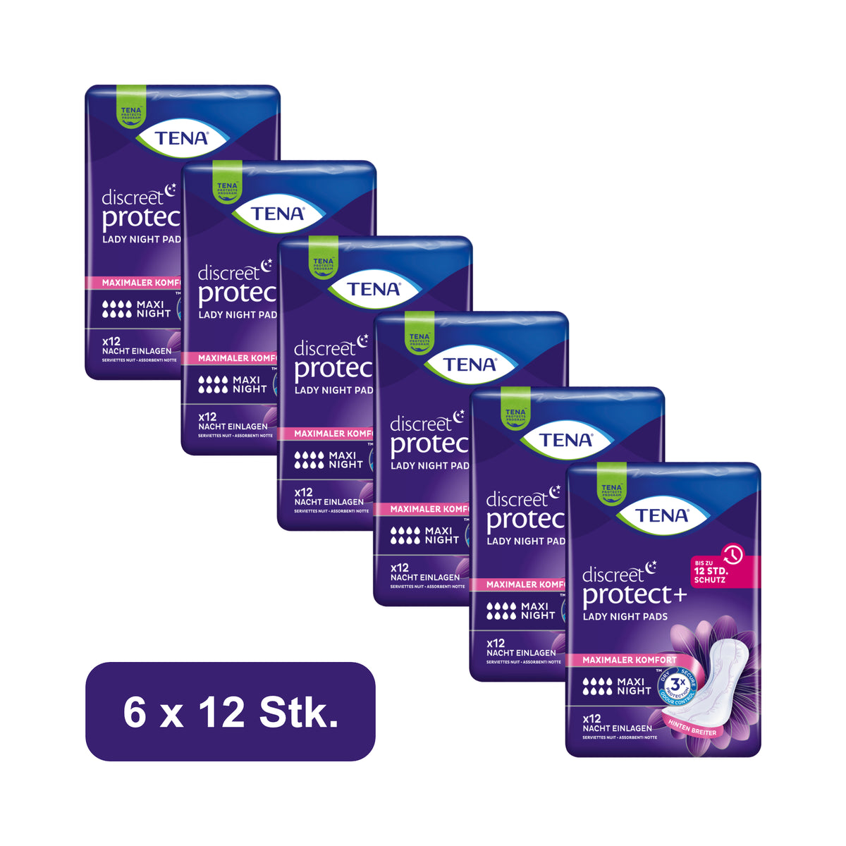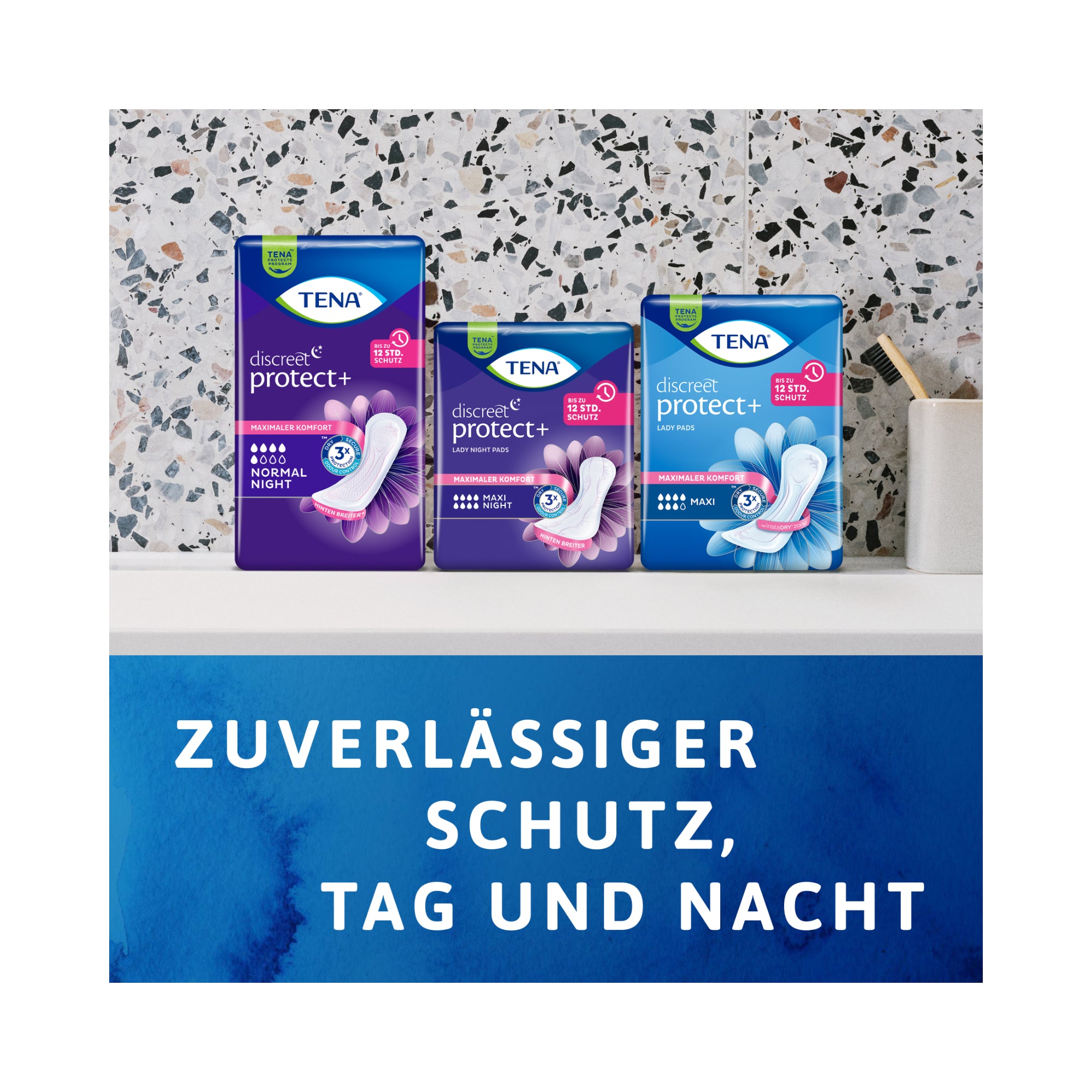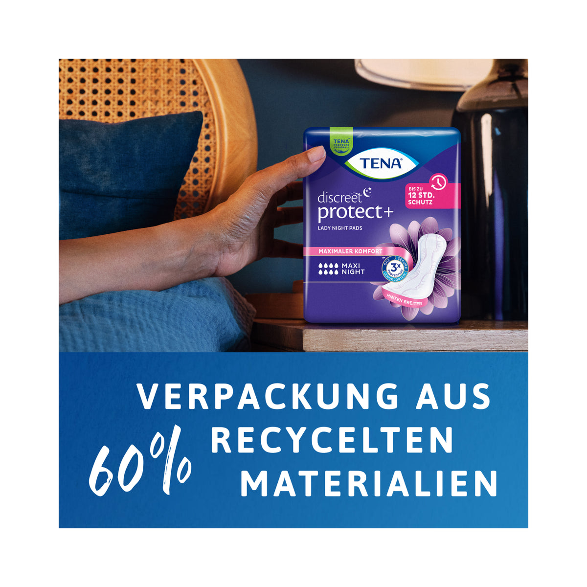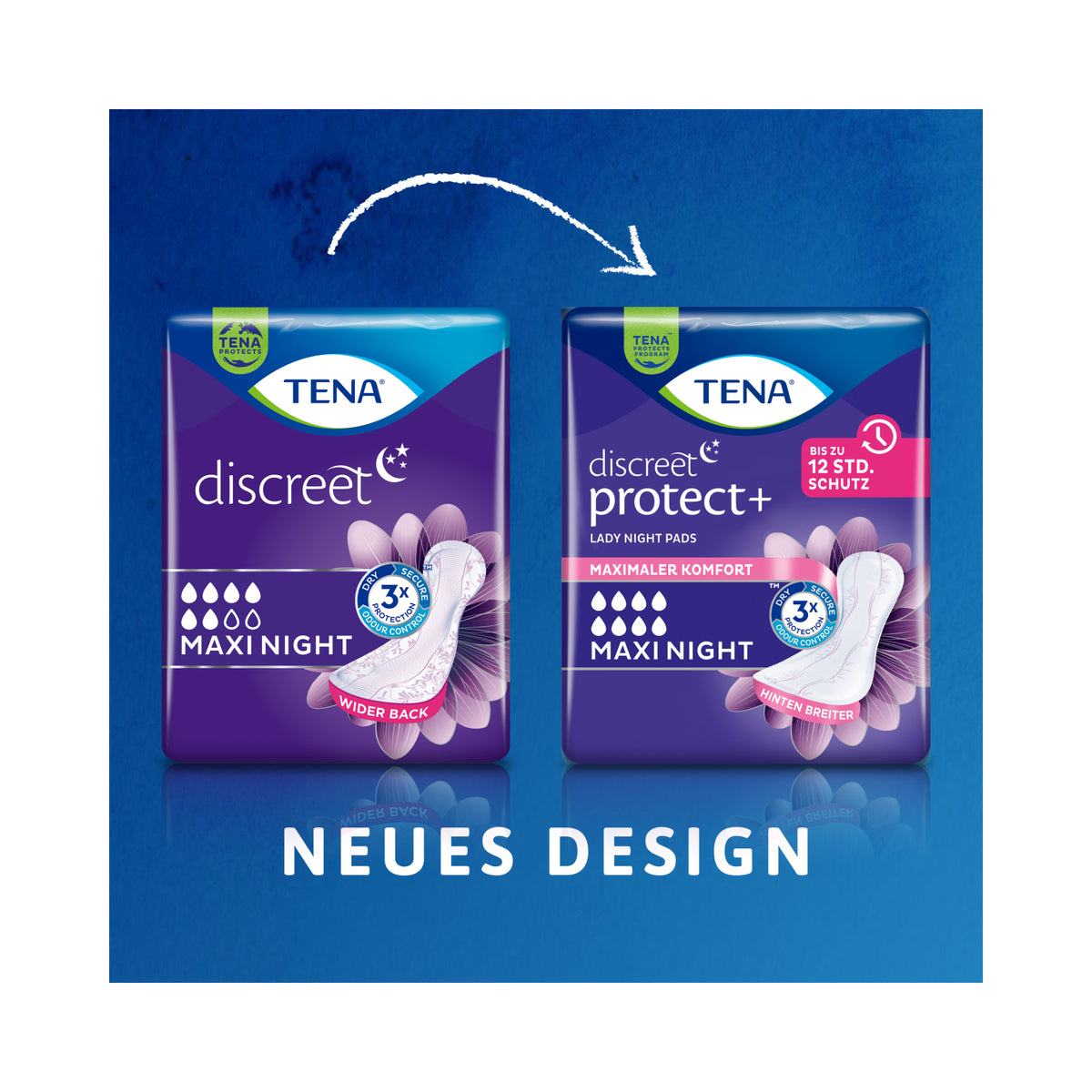 TENA Lady Discreet Maxi Night bietet Frauen mit mittlerer bis schwerer Blasenschwäche während der Nachtstunden zuverlässigen Schutz und höchsten Komfort. Diese speziell für die Nacht entwickelten Einlagen gewährleisten dank ihres durchdachten Designs und fortschrittlicher Technologien ein trockenes und sicheres Gefühl bis zu 12 Stunden lang.
