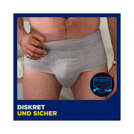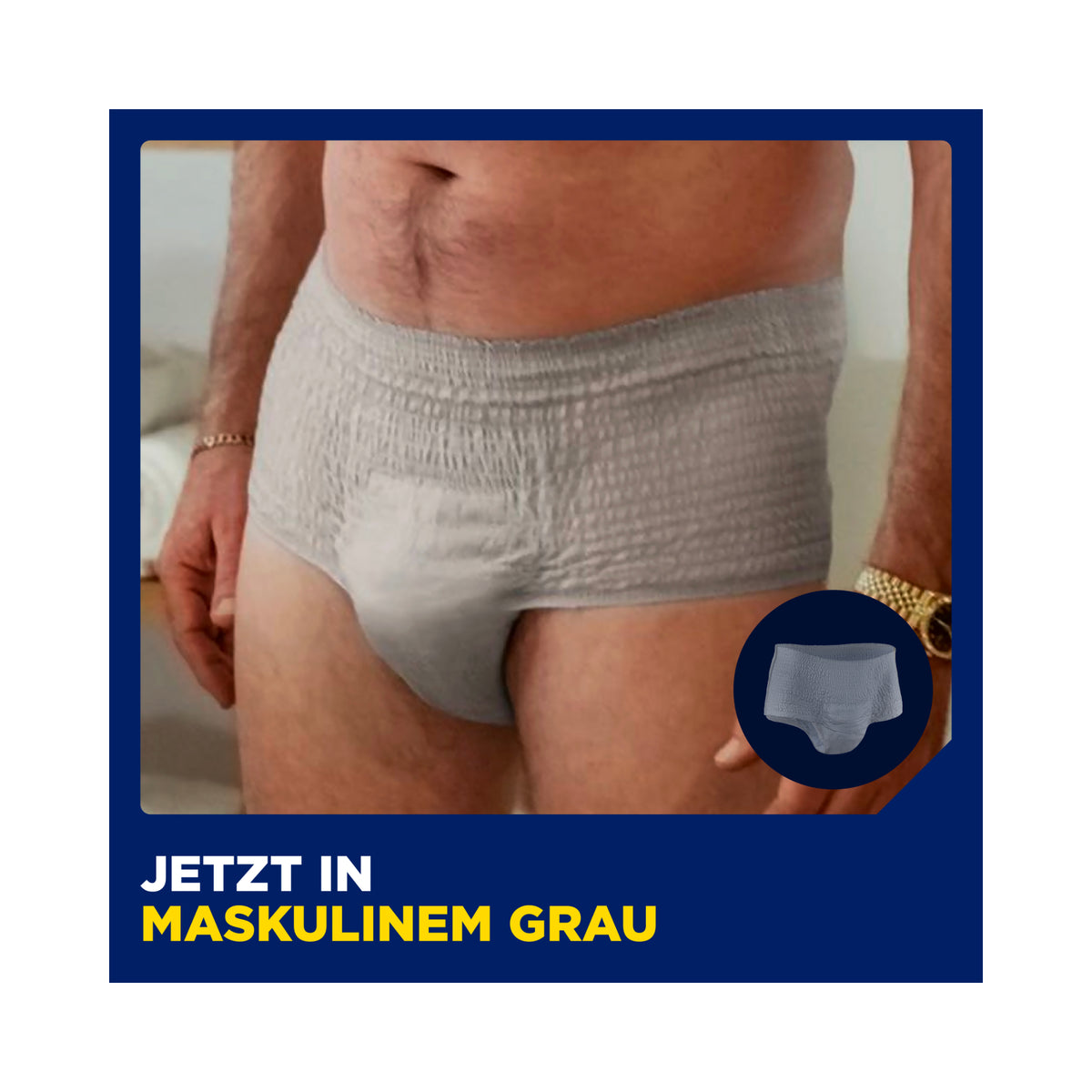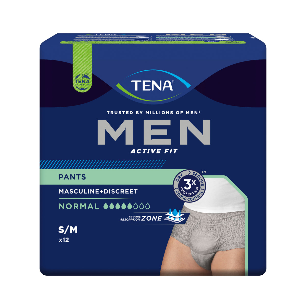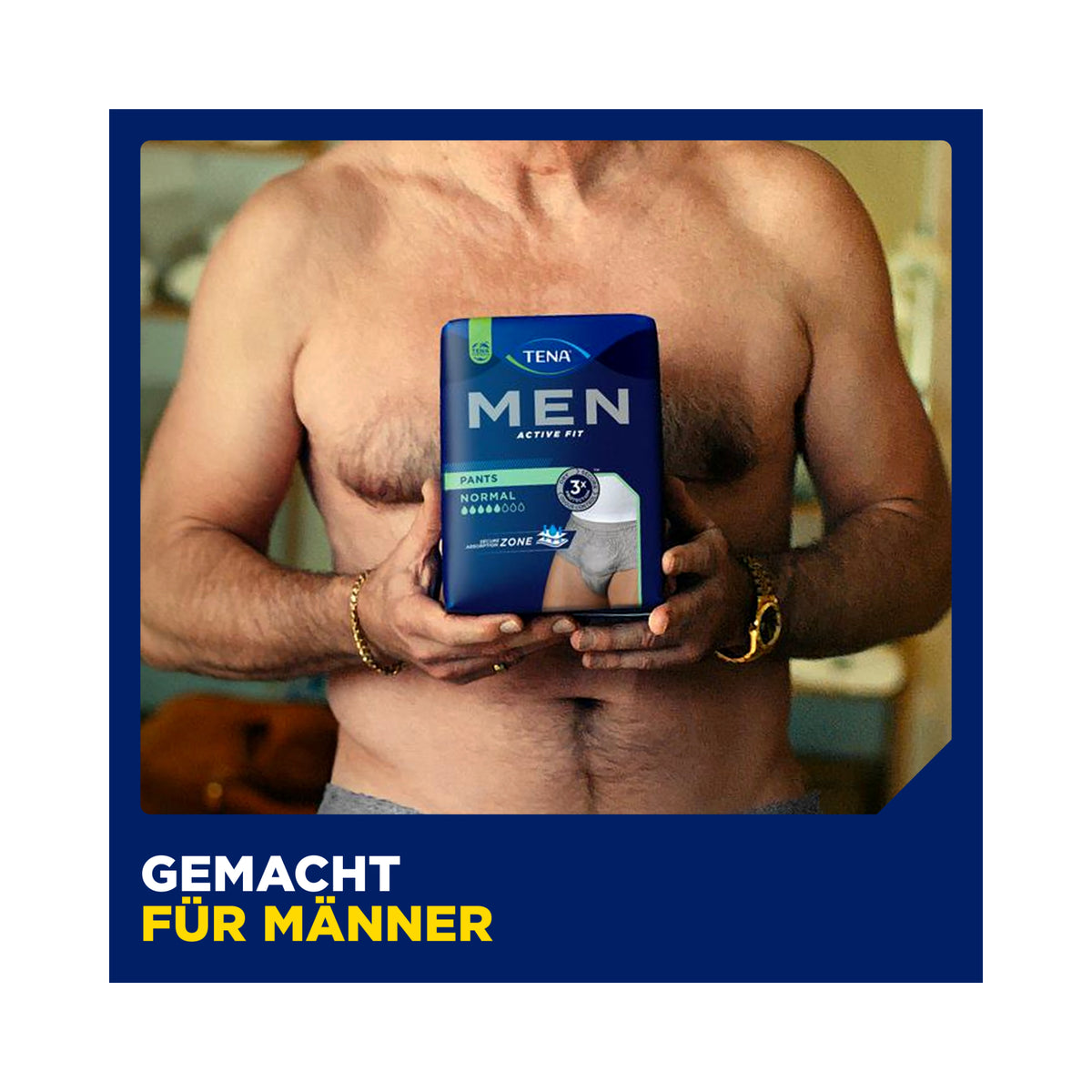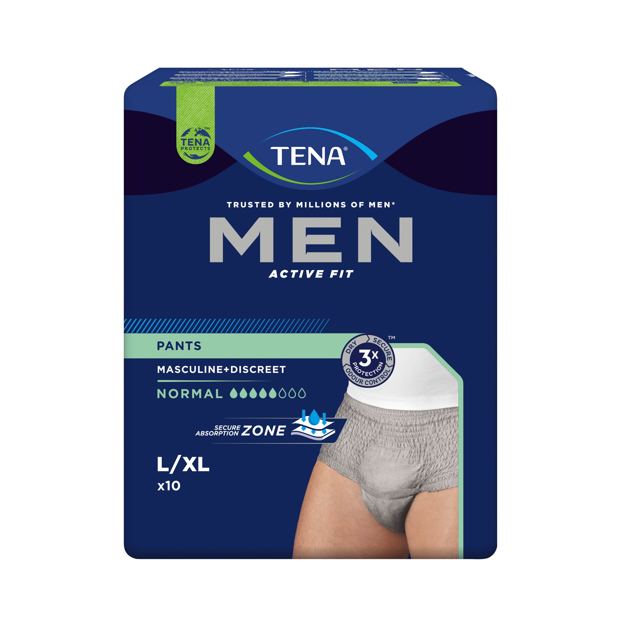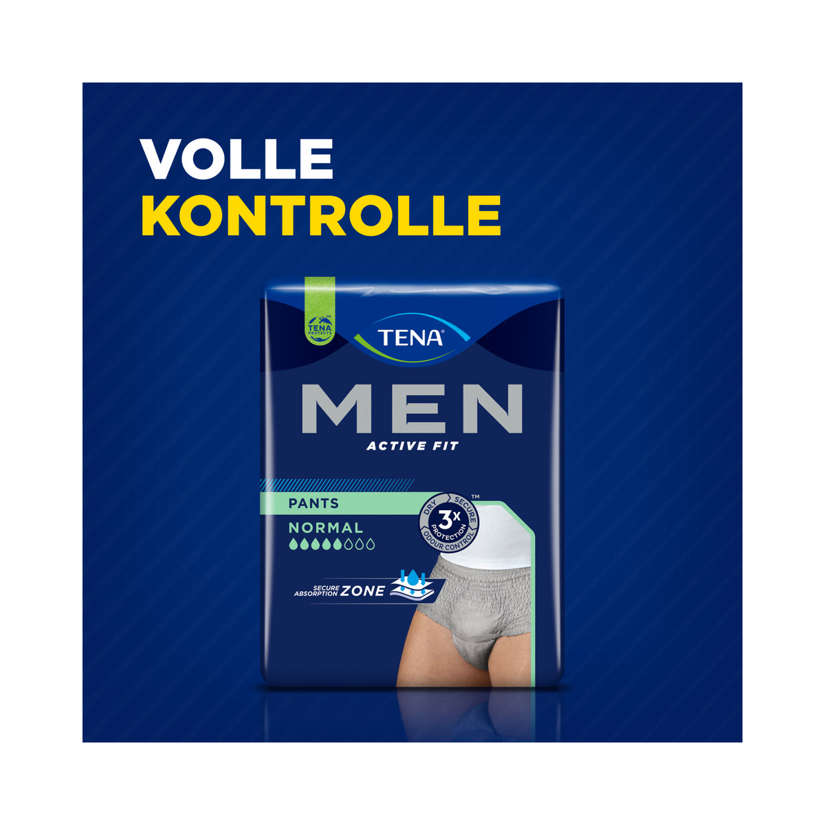 TENA Men Active Fit Pants Normal sind speziell entwickelte Inkontinenzhosen für Männer, die bei mittelstarkem Harnverlust zuverlässigen Schutz und höchsten Tragekomfort bieten. Ihr maskuliner Schnitt und die dezente graue Farbe verleihen ihnen das Aussehen und das Gefühl normaler Unterwäsche.